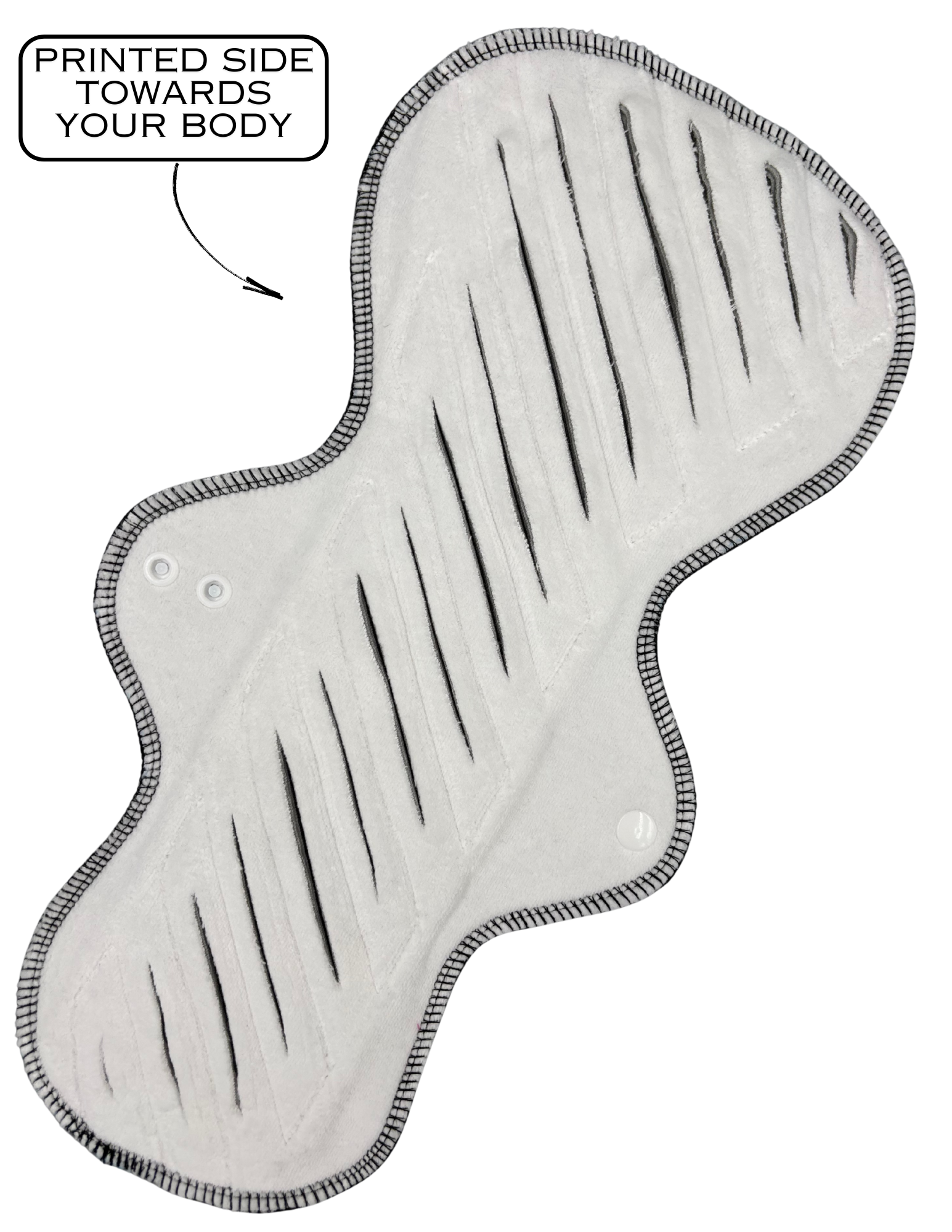 Cotton Velour is a luxuriously soft fabric to have against your vulva. Its texture adds an extra cozy feel while grabbing onto your flow, this coupled with the slits in the fabric provide additional surface area for absorption and will help distribute your flow more evenly throughout the pad, reducing the chances of leakage during heavy gushing flows. These pads are also an excellent choice for those whose menstrual flow favours one side of the pad. The larger side provides additional coverage to either the front or the back, without adding extra bulk to areas that you don't require coverage.