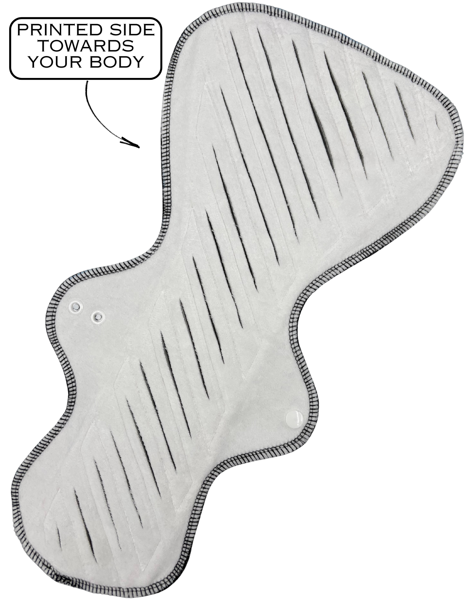 Cotton Velour is a luxuriously soft fabric to have against your vulva. Its texture adds an extra cozy feel while grabbing onto your flow, this coupled with the slits in the fabric provide additional surface area for absorption and will help distribute your flow more evenly throughout the pad, reducing the chances of leakage during heavy gushing flows. These pads are also an excellent choice for those whose menstrual flow favours one side of the pad. The larger side provides additional coverage to either the front or the back, without adding extra bulk to areas that you don't require coverage.